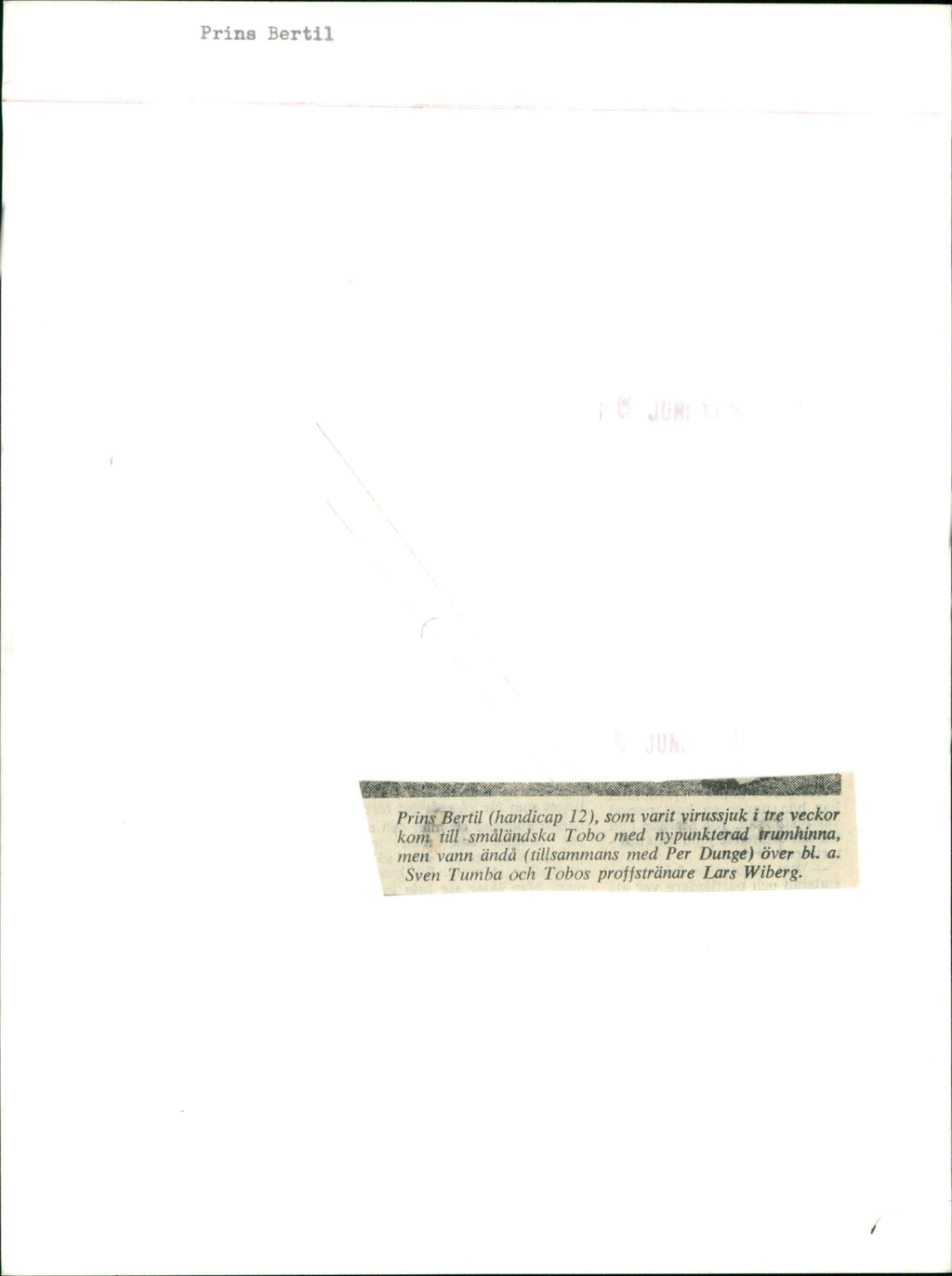 Prince Bertil (handicap 12), who has been a viral disease for three weeks came to Småland Tobo with newly punctured eardrum, but still (together with Per Dunge) won over bl. a. Sven Tumba and Tobo's professional trainer Lars Wiberg.