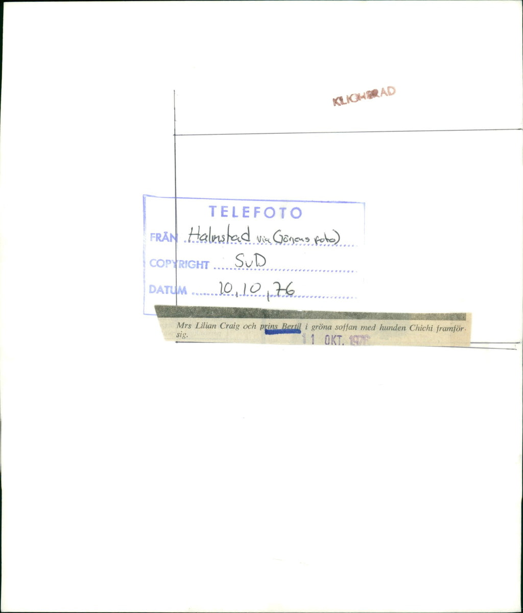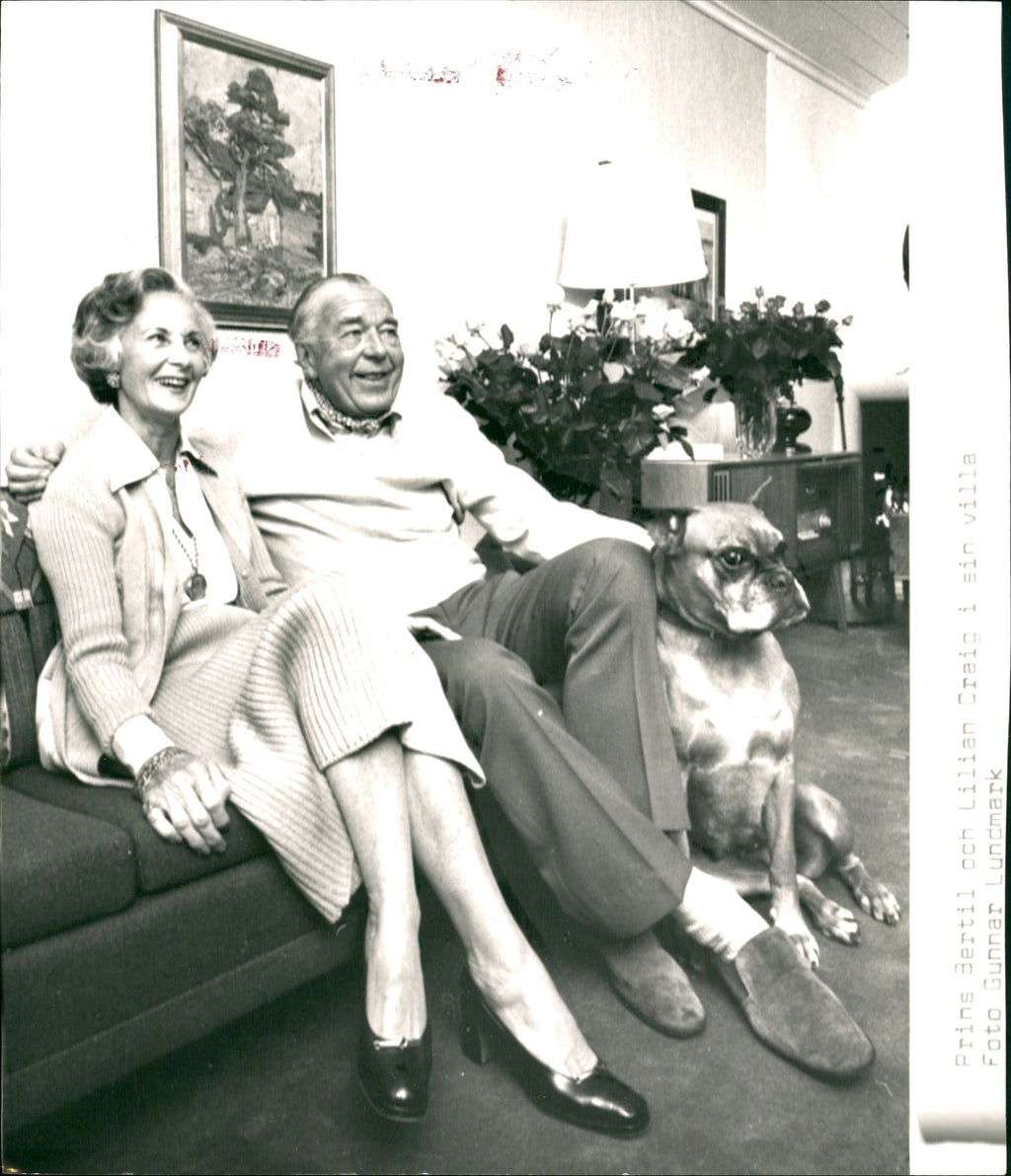 Mrs Lilian Craig (Princess Lilian of Sweden) and Prince Bertil in the green sofa with the dog Chichi in front of him.