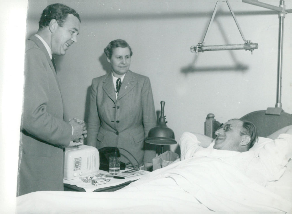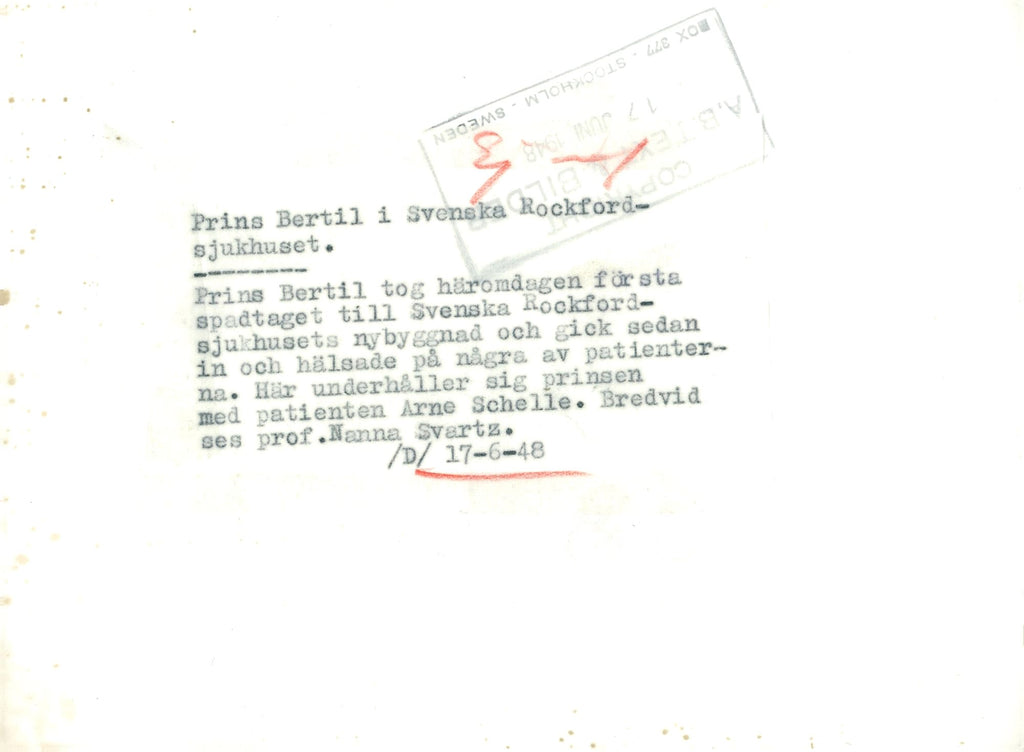 The other day, Prince Bertil took the first spade to the Swedish Rockford Hospital's new building and then went in and greeted some of the patients. Here the prince entertains with the patient Arne Schelle.