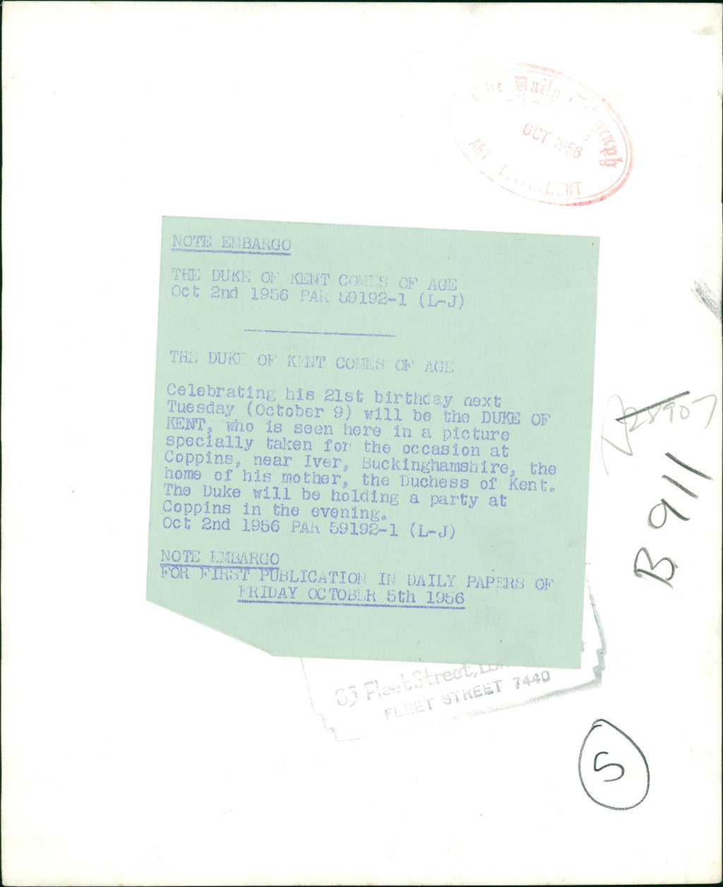Celebrating his 21st birthday will be the Duke of Kent, who is seen here in a photo specially takin for the occasion at the Coppins. Celebrating his 21st birthday will be the Duke of Kent, who is seen here in a photo specially takin for the occasion at the Coppins.