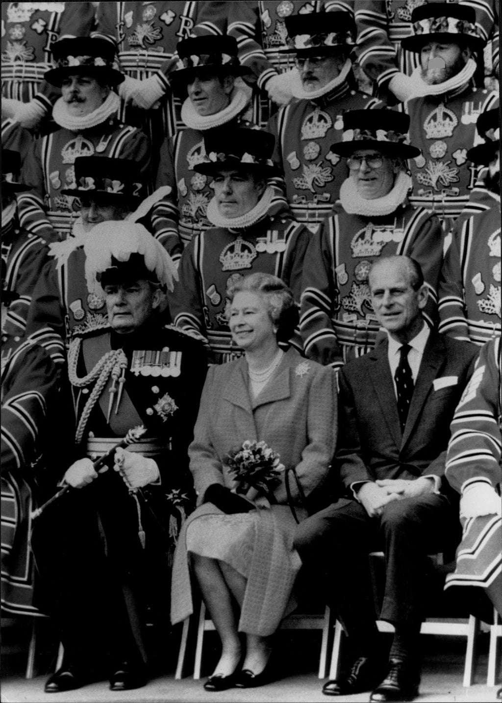 Queen Elizabeth and Prince Philip pose with their Beefeaters Queen Elizabeth II, Prince Philip, Elizabeth II, Duke of Edinburgh