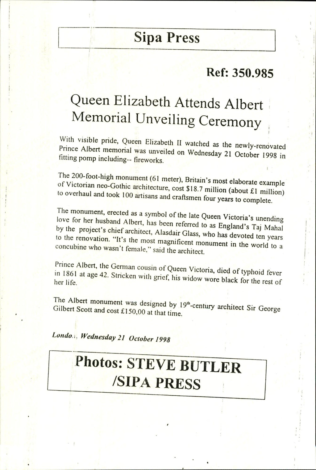 All our press photos are LIMITED ARCHIVE ORIGINALS - they are the actual prints that were used by the newspapers, they are not reprints or digital prints produced by us. All the prints are at least 30 years old and up to 100 years old.