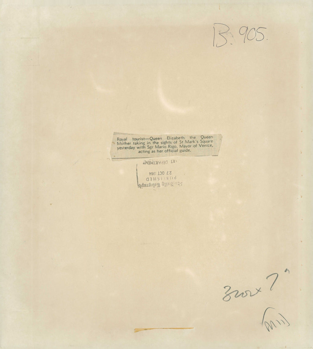 Queen Elizabeth the Queen Mother taking in the sights of St. Mark's Square with Sgr Mario Rigo, Mayor of Venice , acting as her official guide. Queen Elizabeth the Queen Mother taking in the sights of St. Mark's Square with Sgr Mario Rigo, Mayor of Venice , acting as her official guide.