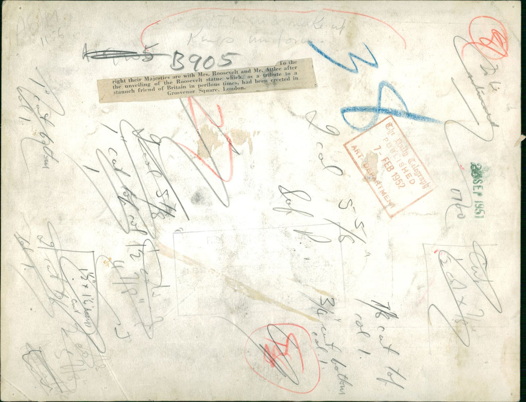 To the right their Majesties are with Mrs. Roosevelt and Mr. Attlee after the unveiling of the Roosevelt statue which, as a tribute to a stanneh friend of Britain in perilous times, had been created in Grosvenoe Square, London. To the right their Majesties are with Mrs. Roosevelt and Mr. Attlee after the unveiling of the Roosevelt statue which, as a tribute to a stanneh friend of Britain in perilous times, had been created in Grosvenoe Square, London.