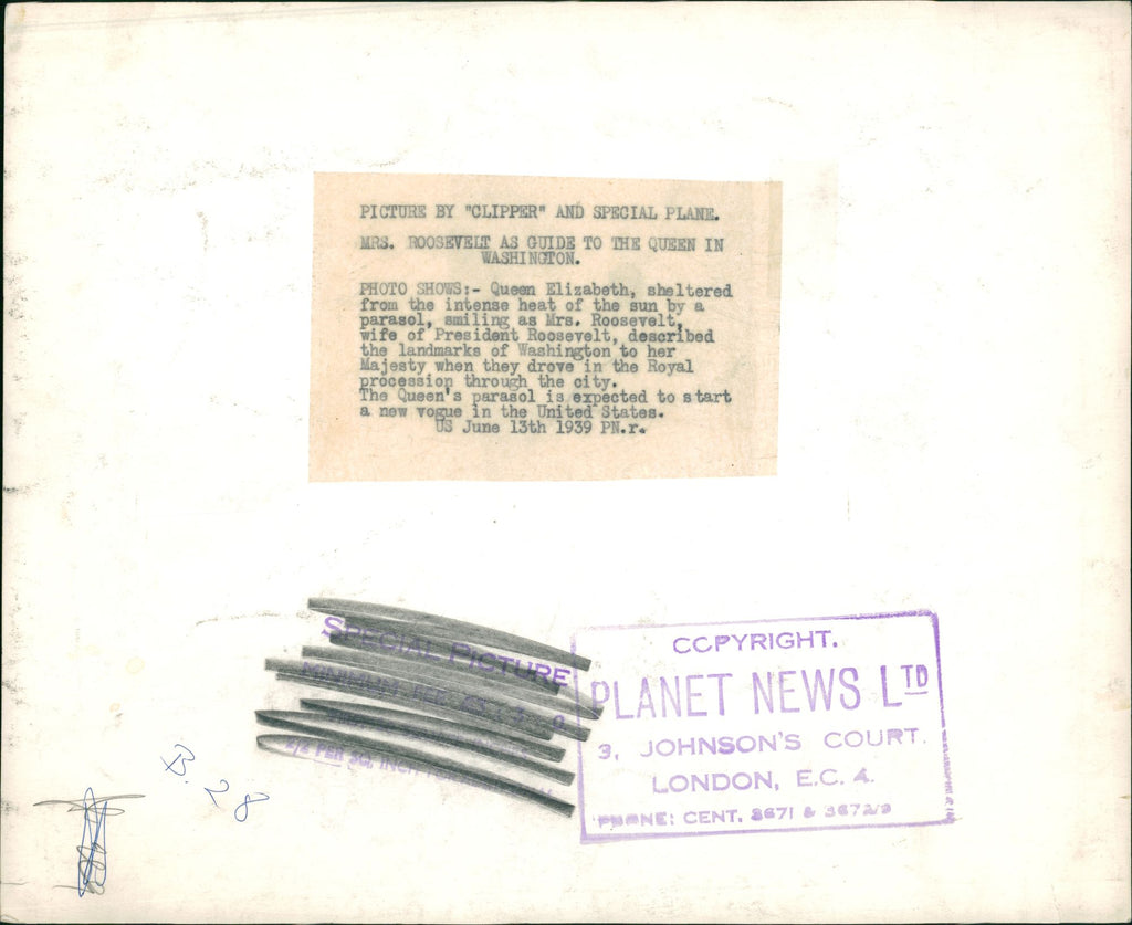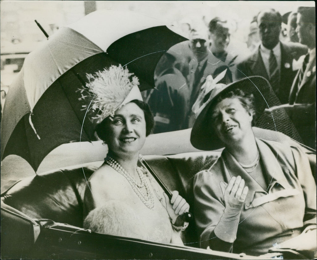 Queen Elizabeth, sheltered from the intense heat of the sun by a parasel, smiling as Mrs. Roosevelt, wife of President Roosevelt, described the landmarks of Washington to her Majesty when they drove in the Royal procession through the city. Queen Elizabeth, sheltered from the intense heat of the sun by a parasel, smiling as Mrs. Roosevelt, wife of President Roosevelt, described the landmarks of Washington to her Majesty when they drove in the Royal procession through the city.
