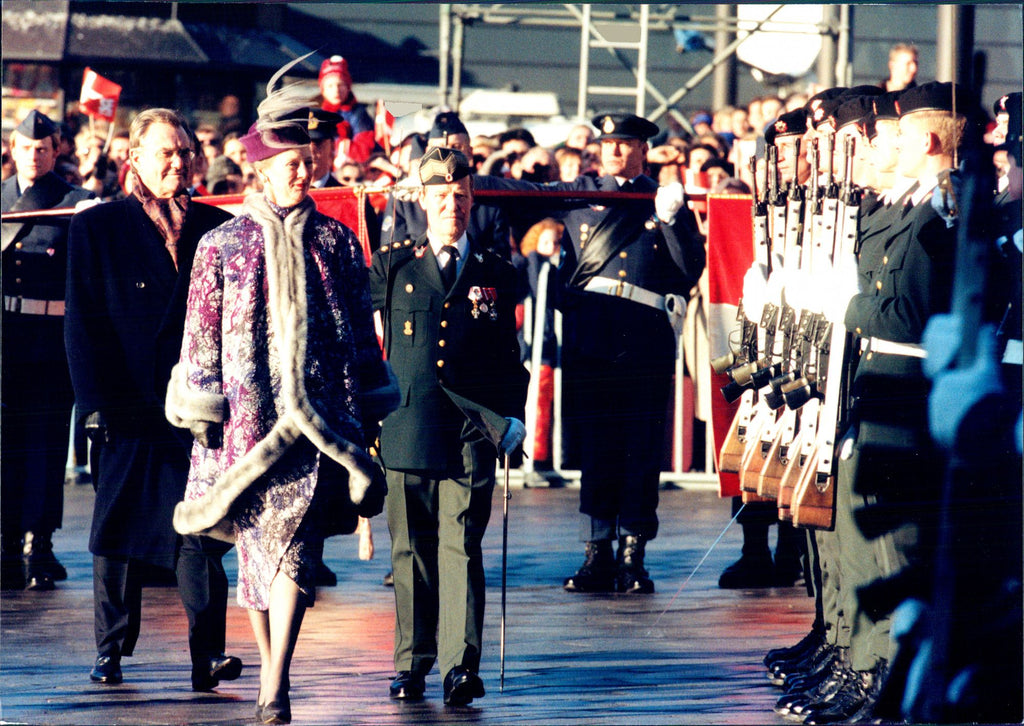 Queen Margrethe inspects the guard at the town hall square. Behind her is Prince Henry. Margrethe II of Denmark, Queen, Royal, Royal, Queen Margrethe inspects the guard at the town hall square. Behind her is Prince Henry. Margrethe II of Denmark, Queen, Royal, Royal,