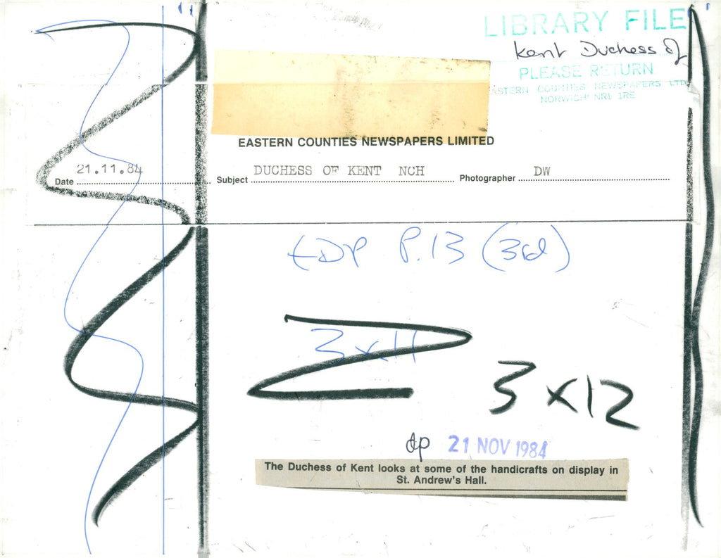 The Duchess of Kent looks at some of the handicrafts at St. Andrew's Hall - Vintage Photograph