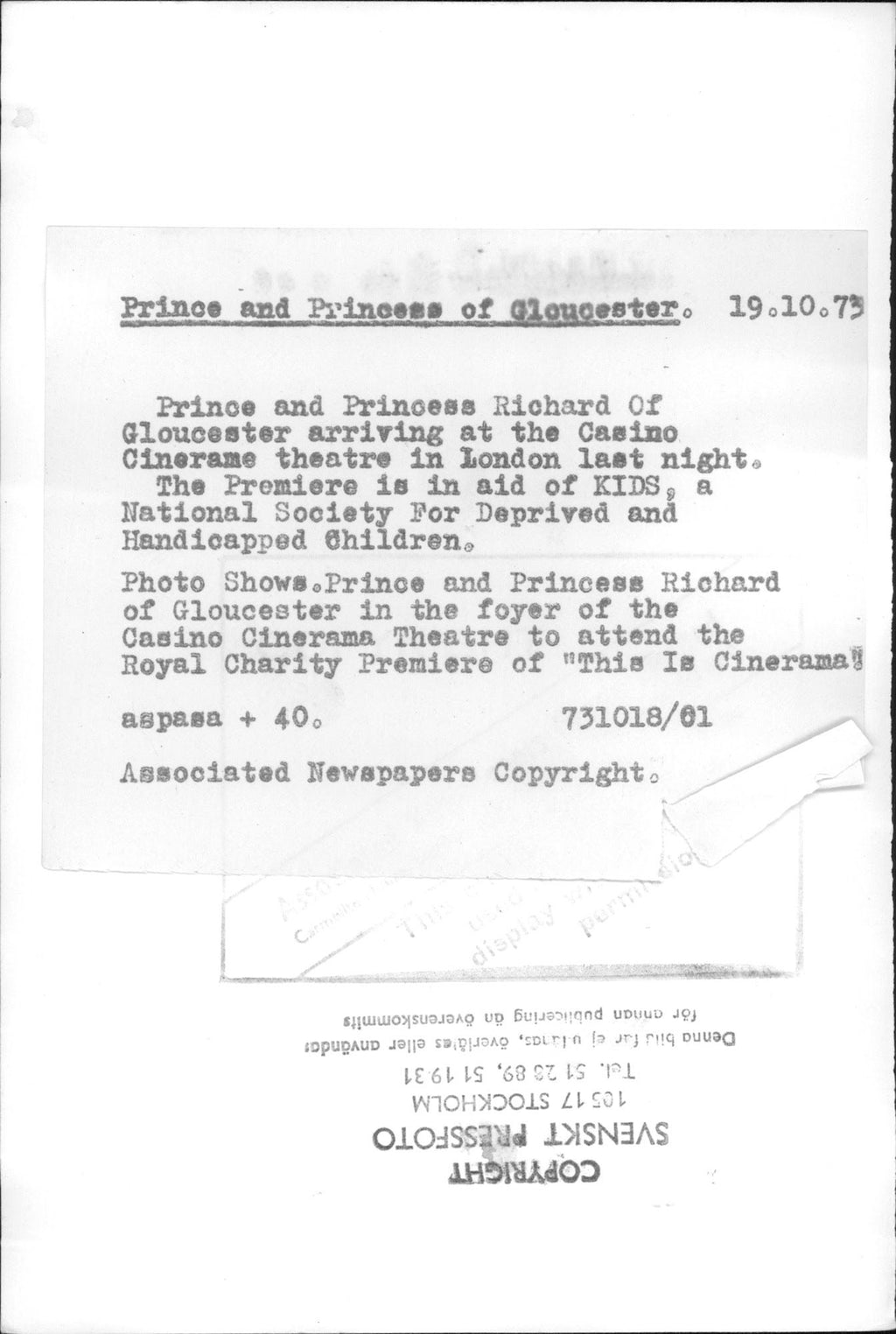 The Duke and Duke of Gloucester arrive at the Casino Cinerame Theater to host a charity show Prince Richard, Duke of Gloucester, Birgitte, Duchess of Gloucester, Birgitte van Deurs, Birgitte Eva Henriksen, Prince Henrik