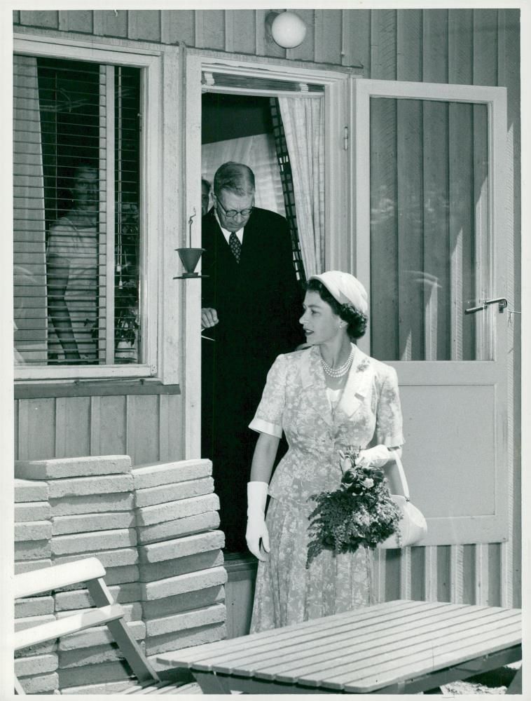 The King and Queen Elizabeth leave Ängbyhyllan. - Vintage Photograph