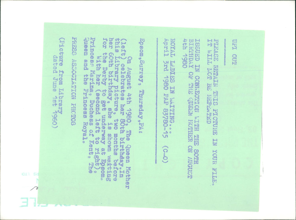 The Queen Mother celebrates her 80th birthday on August 4th 1980. In this Library picture, two months before her birthday, she is shown waiting for the Derby to get underway at Epsom. With her, Princess Marina, Duchess of Kent, The Queen and the Princess Royal.