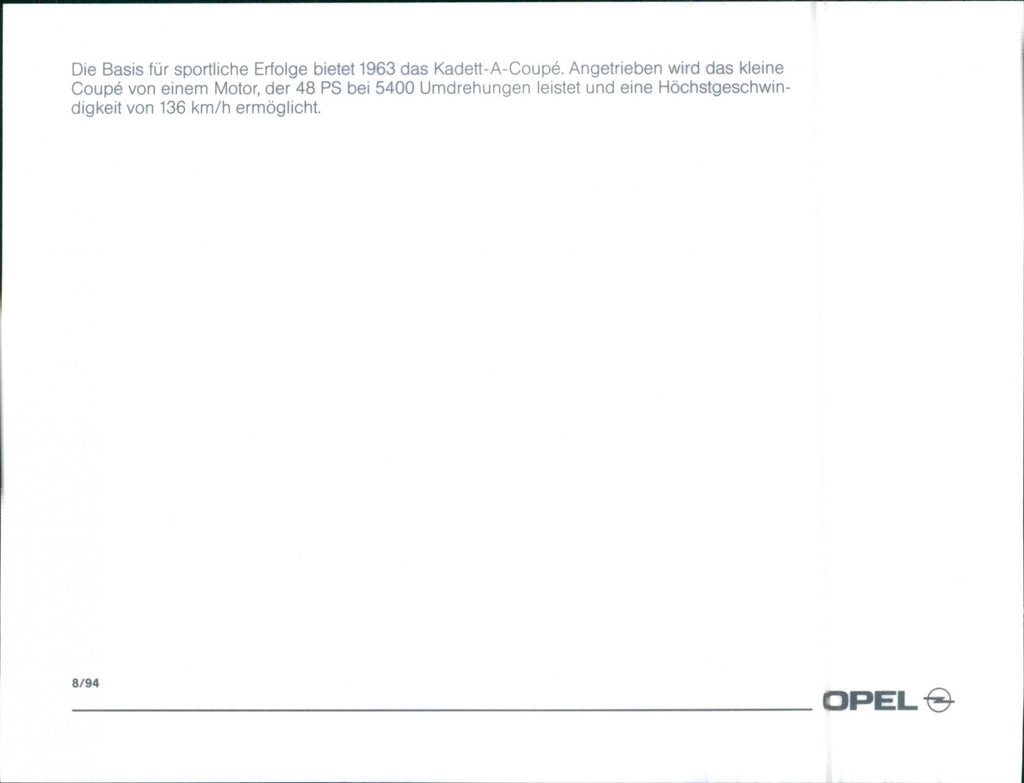 The basis for sporting success was the 1963 Kadett-A-Coupé. The small coupé is powered by an engine that delivers 48 hp at 5400 rpm and enables a top speed of 136 km / h.