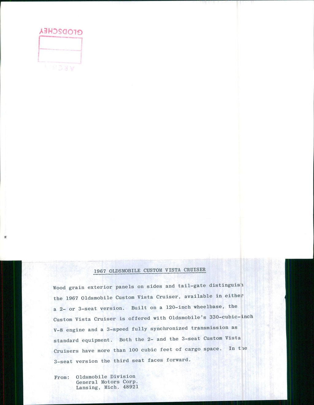 Wood grain exterior panels on sides and tail-gate distinguish the 1967 Oldsmobile Custom Vista Cruiser, available in either a 2- or 3-seat version. Built on a 120-inch wheelbase, the Custom Vista Cruiser is offered with Oldsmobile's 330-cubic-inch V-8 engine and a 3-speed fully synchronized transmission as standard equipment.