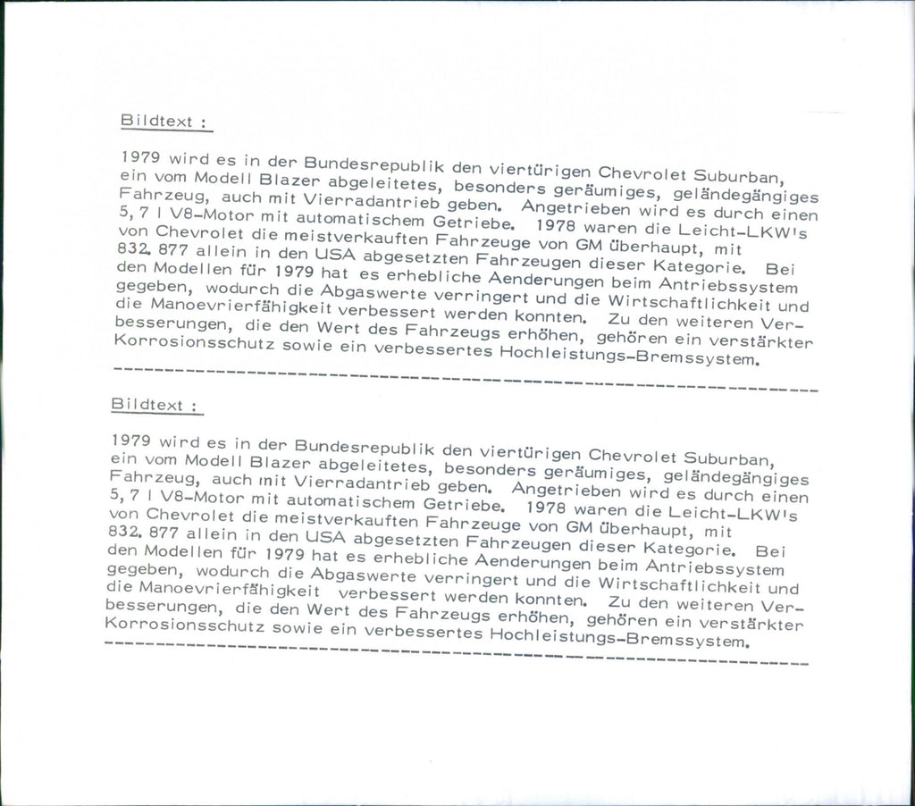 1979 Chevrolet Suburban, a particularly spacious, all-terrain vehicle derived from the Blazer model, also with four-wheel drive.