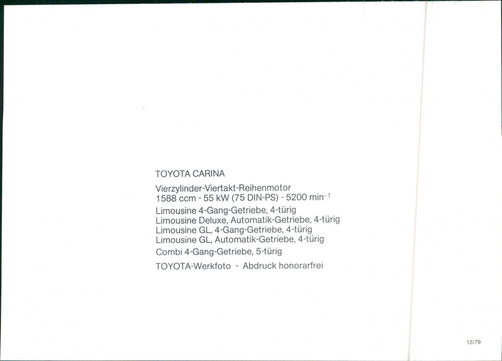 Toyota Carina. Four-cylinder four-stroke in-line engine 1588 cc - 55 kW (75 DIN-PS) - 5200 min. Limousine 4-speed transmission, 4 doors. Limousine Deluxe, Automatic transmission, 4 doors. Limousine GL, 4-speed gearbox, 4-door. Limousine GL, Automatic transmission, 4 doors. Combi 4-speed transmission, 5 doors.