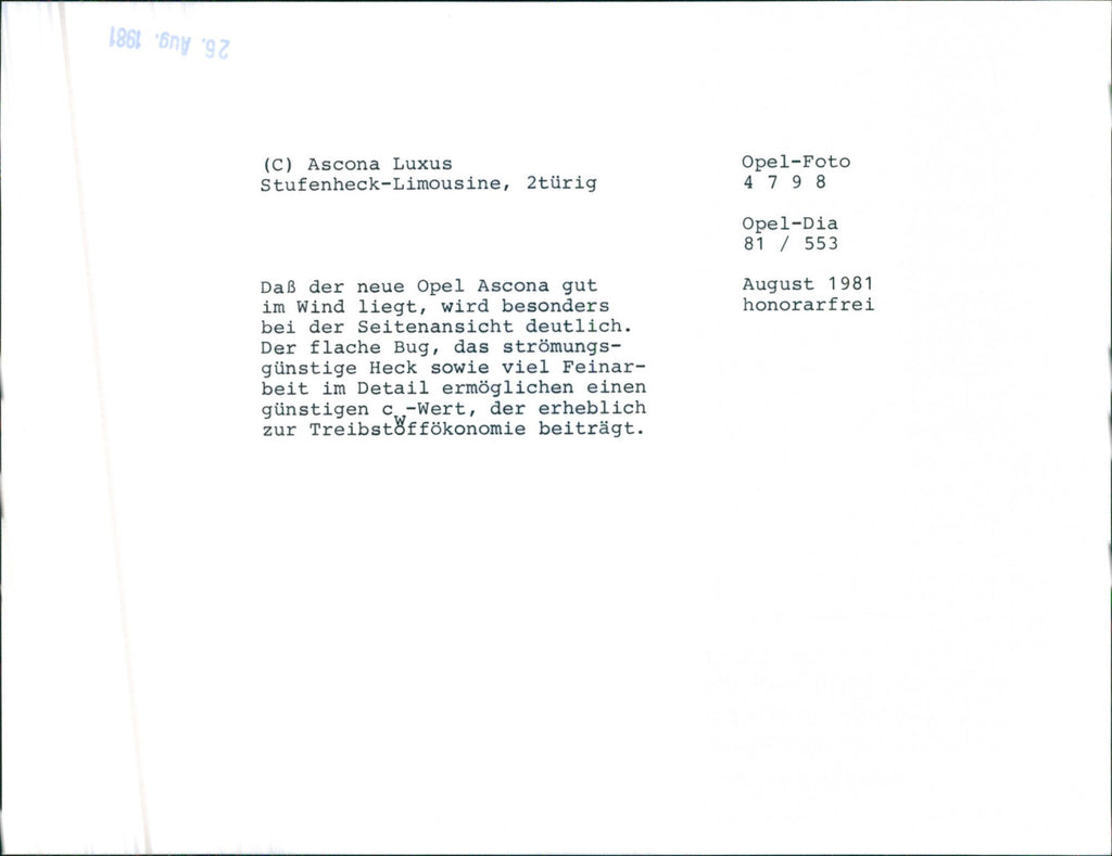 Ascona luxury saloon sedan, 2 doors. The side view shows that the new Opel Ascona is good in the wind. The flat bow, the streamlined stern and a lot of fine work in detail enable a favorable c-value, which contributes significantly to the fuel economy.