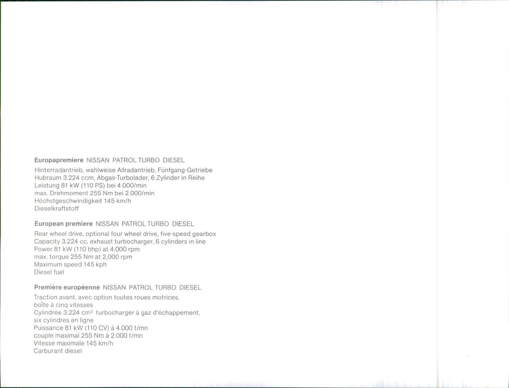 Nissan Patrol Turbo Diesel; Rear wheel drive, optional four wheel drive, five-speed gearbox; Capacity 3,224 cc, exhaust turbocharger, 6 cylinders in line; Power 81 kW (110 bhp) at 4,000 rpm, max. torque 255 Nm at 2,000 rpm; Maximum speed 145 kph; Diesel fuel.