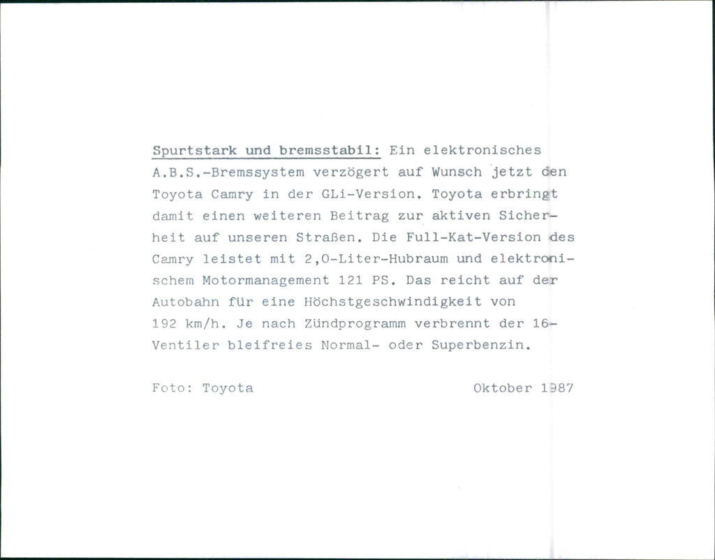 An electronic ABS braking system now decelerates the Toyota Camry in the GLi version on request. Toyota thus makes a further contribution to active safety on our roads. The full-cat version of the Camry delivers 121 hp with a 2.0 liter displacement and electronic engine management. That's enough on the highway for a top speed of 192 km / h. Depending on the ignition program, the 16-valve burns unleaded regular or premium gasoline.