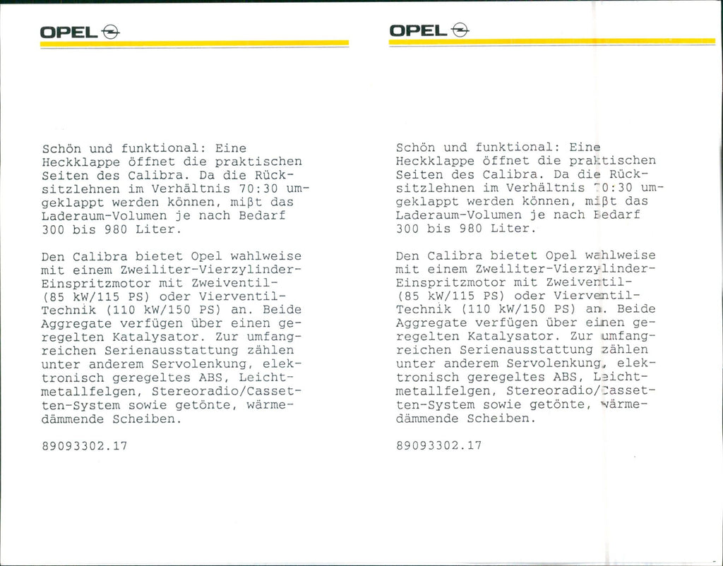 1989 Opel Calibra Beautiful and functional: a tailgate opens the practical side of the Calibra. Since the rear seat backrests can be folded down in a ratio of 70:30, the load space volume measures 300 to 980 liters, depending on requirements.