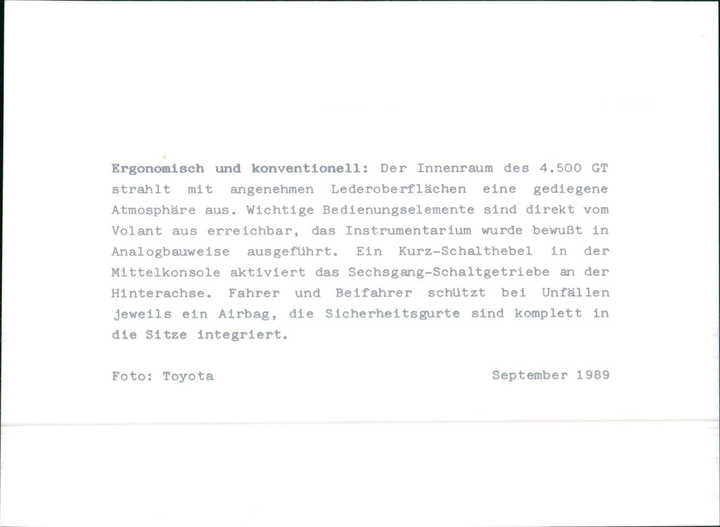 1989 Toyota GT 4500, Ergonomic and conventional, the interior of the 4,500 GT radiates a solid atmosphere with pleasant leather surfaces. Important controls can be reached directly from the valance, the instruments have been deliberately designed in an analog design.