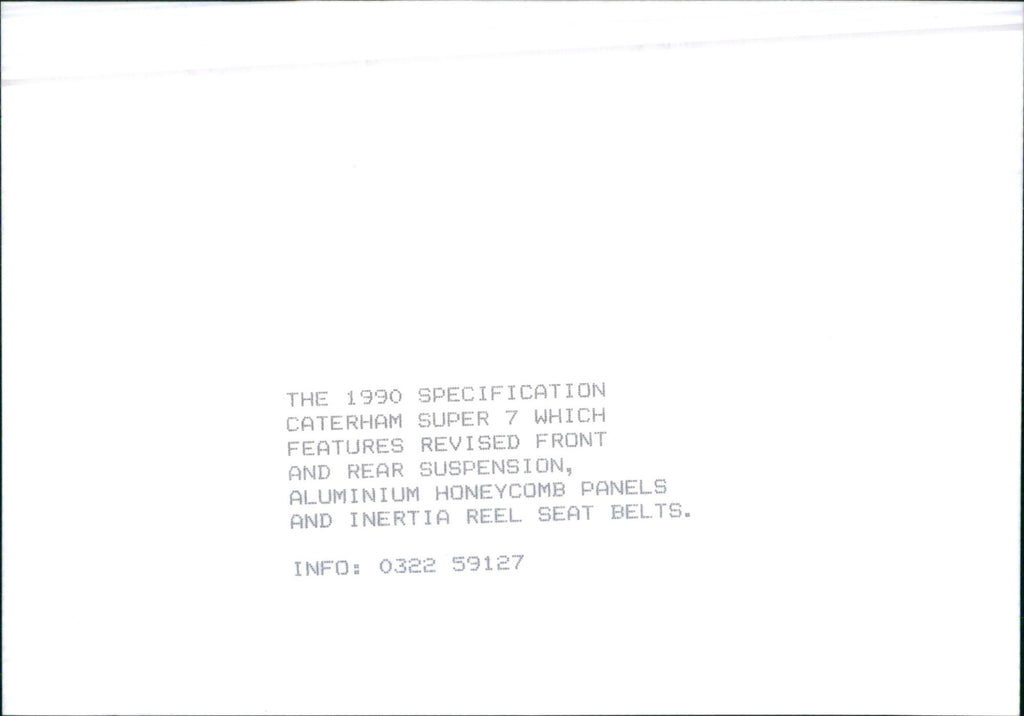The 1990 Specification Caterham Super 7 which features revised front and rear suspension, aluminum honeycomb panels and inertia reel seat belts.