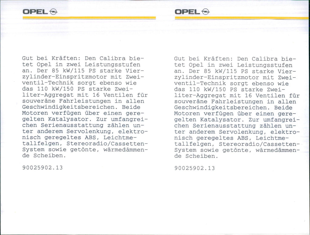 1990 Opel Calibra, Opel offers the Calibra either with a two-liter four-cylinder injection engine with two-valve (85 kW / 115 hp) or four-valve technology (110 kW / 150 hp). Both units have a regulated catalytic converter.