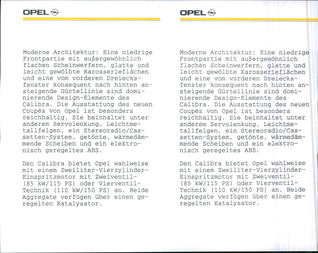1990 Opel Calibra , Opel offers the Calibra either with a two-liter four-cylinder injection engine with two-valve (85 kW / 115 hp) or four-valve technology (110 kW / 150 hp).