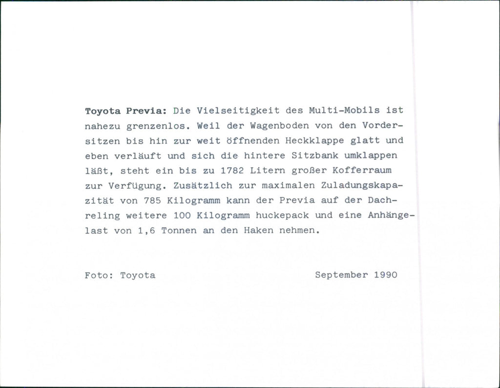 Toyota Previa, the versatility of the multi-mobile is almost limitless. Because the floor of the car runs smoothly and evenly from the front seats to the wide opening tailgate and the rear seat can be folded down, a luggage compartment of up to 1782 liters is available. In addition to the maximum payload capacity of 785 kilograms, the Previa on the roof rails can piggyback another 100 kilograms and a trailer load of 1.6 tons
