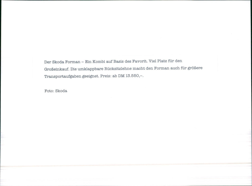 The Skoda Forman A station wagon based on the Favorit. Plenty of space for bulk purchases. The foldable rear seat backrest makes the Forman also suitable for larger transport tasks. Price: from DM 13,550.