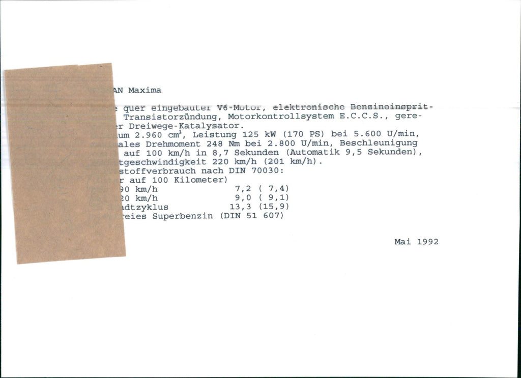 1993 Nissan Maxima, dust consumption according to DIN 70030: at 100 kilometers) 90 km / h 20 km / h dt cycle of super gasoline