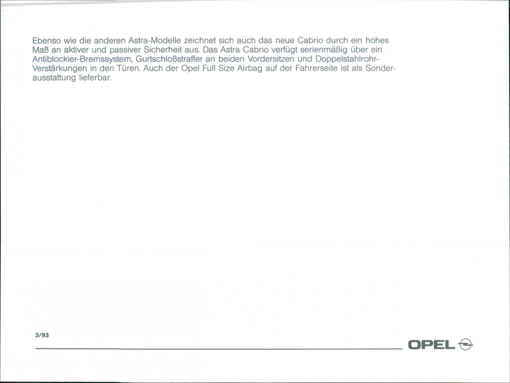 The Astra Cabrio comes standard with an anti-lock braking system, belt buckle tensioner on both front seats and double steel tube reinforcements in the doors. The Opel full-size airbag on the driver's side is also available as an option.