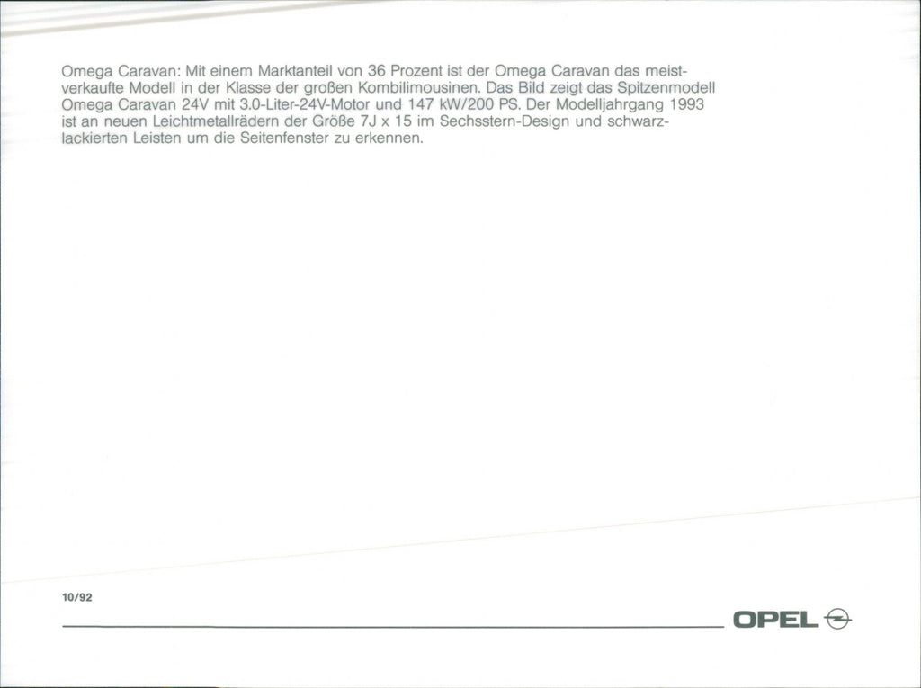 1993 Opel Omega Caravan: The top model Omega Caravan 24V with 3.0-liter 24V engine and 147 kW / 200 PS. The 1993 model year can be recognized by the latest 7J x 15 alloy wheels in six-star design and black-painted strips around the side windows.