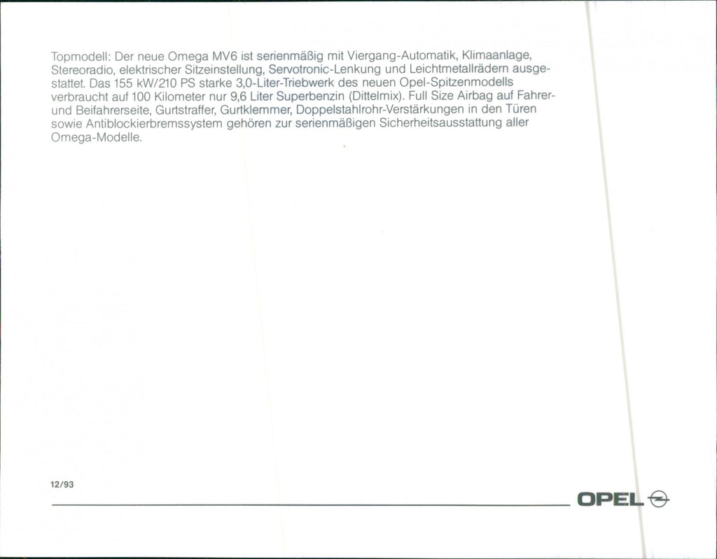Top model: The new Omega MV6 is equipped as standard with four-speed automatic transmission, air conditioning, stereo radio, electric seat adjustment, Servotronic steering and alloy wheels.