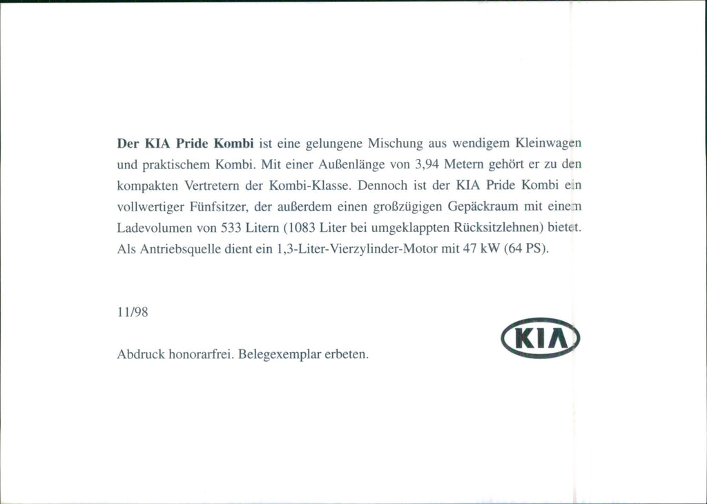 The Kia Pride station wagon is a successful mix of agile small car and practical station wagon. With an external length of 3.94 meters, it is one of the compact representatives of the station wagon class.