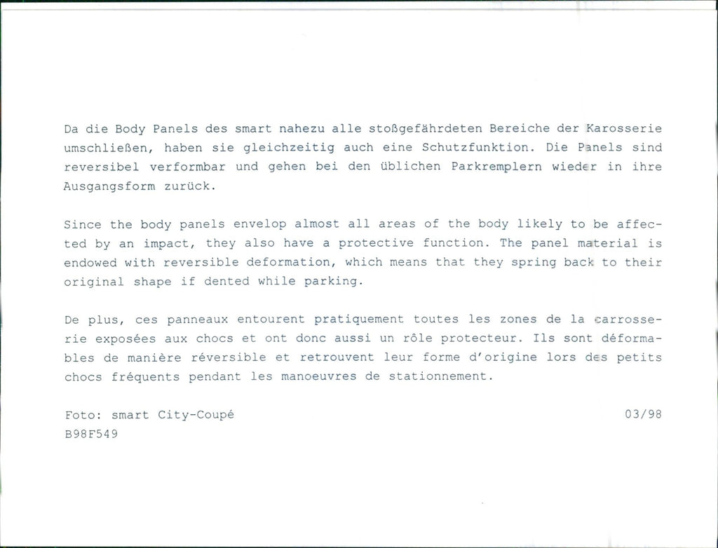 Since the body panels envelop almost all areas of the body likely to be affected by an impact, they also have a protective function. The panel material is endowed with reversible deformation, which means that they spring back to their original shape if dented while parking.