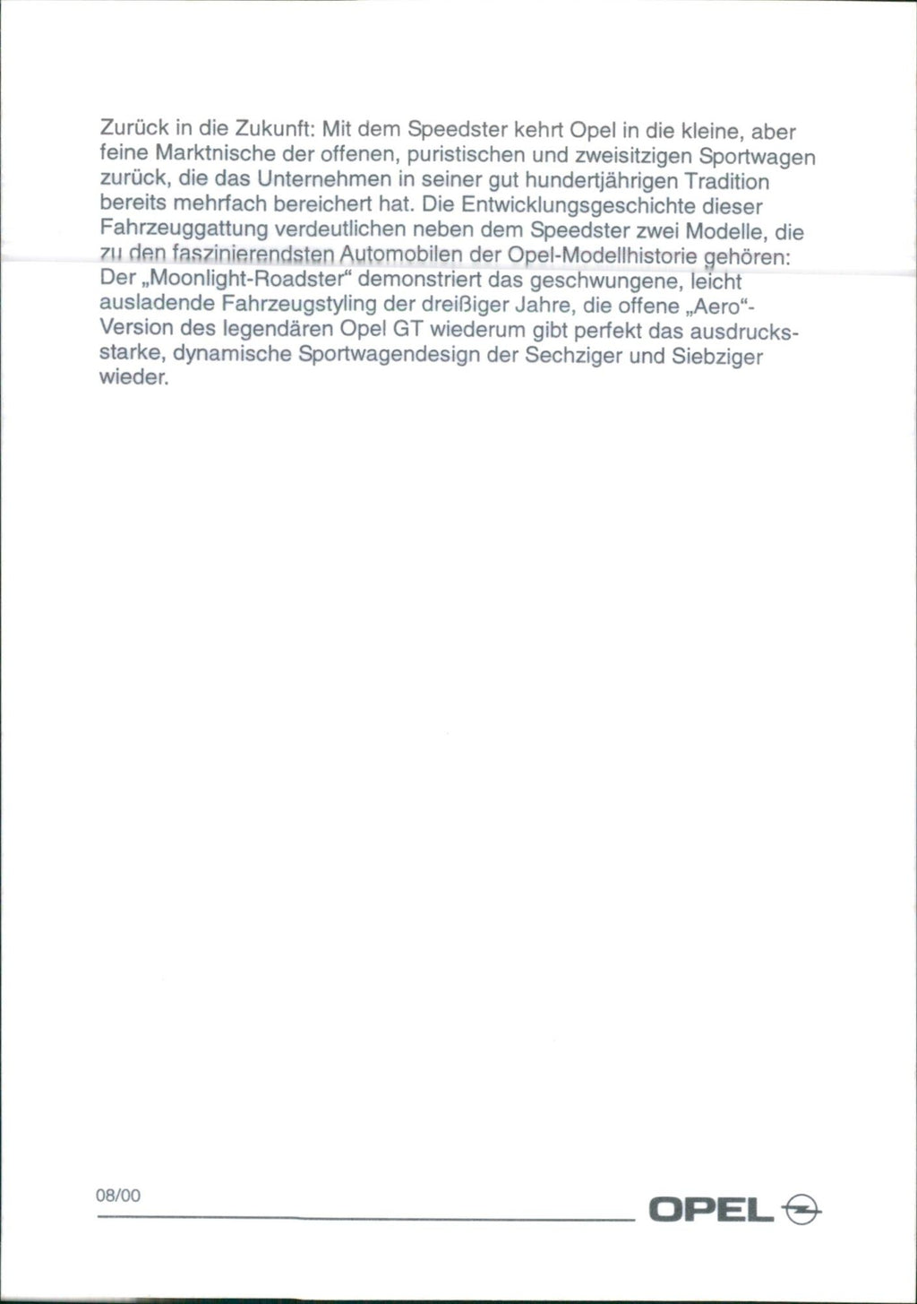 With the Speedster, Opel is returning to the small but fine market. In addition to the Speedster, the development history of this vehicle category is illustrated by two models that belong to the most fascinating automobiles in Opel's model history: the "Moonlight Roadster".