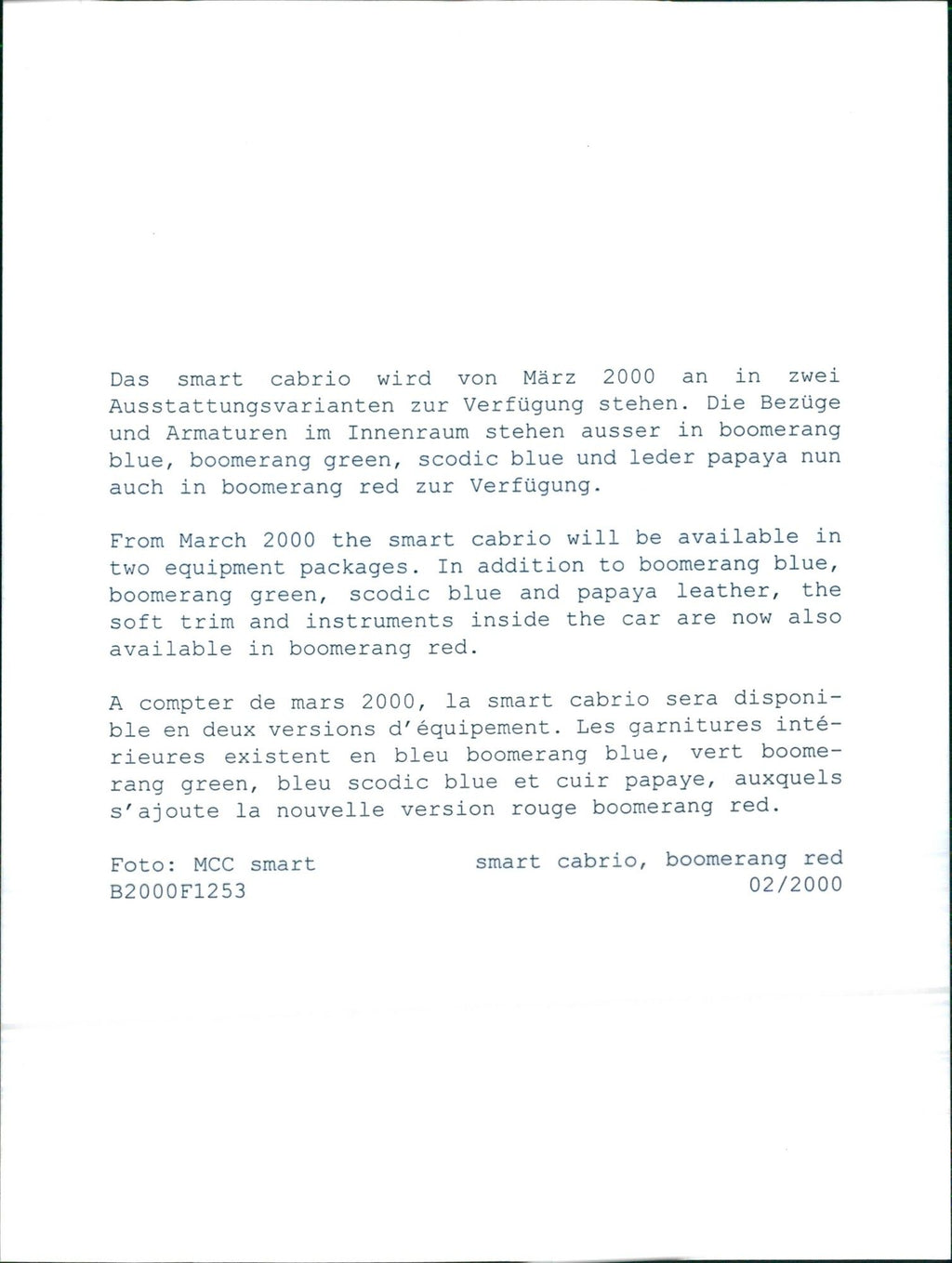 From March 2000 the smart cabrio will be available in two equipment packages. In addition to boomerang blue, boomerang green, scodic blue and papaya leather, the now also soft trim and instruments inside the car are available.