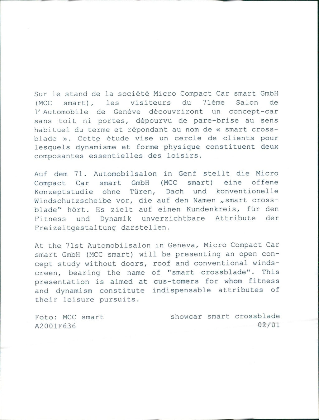 Micro Compact Car smart GmbH (MCC smart) will be presenting an open concept study without doors, roof and conventional winds- creen, bearing the presentation is aimed at customers for whom fitness and dynamism their leisure pursuits. name of "smart crossblade".