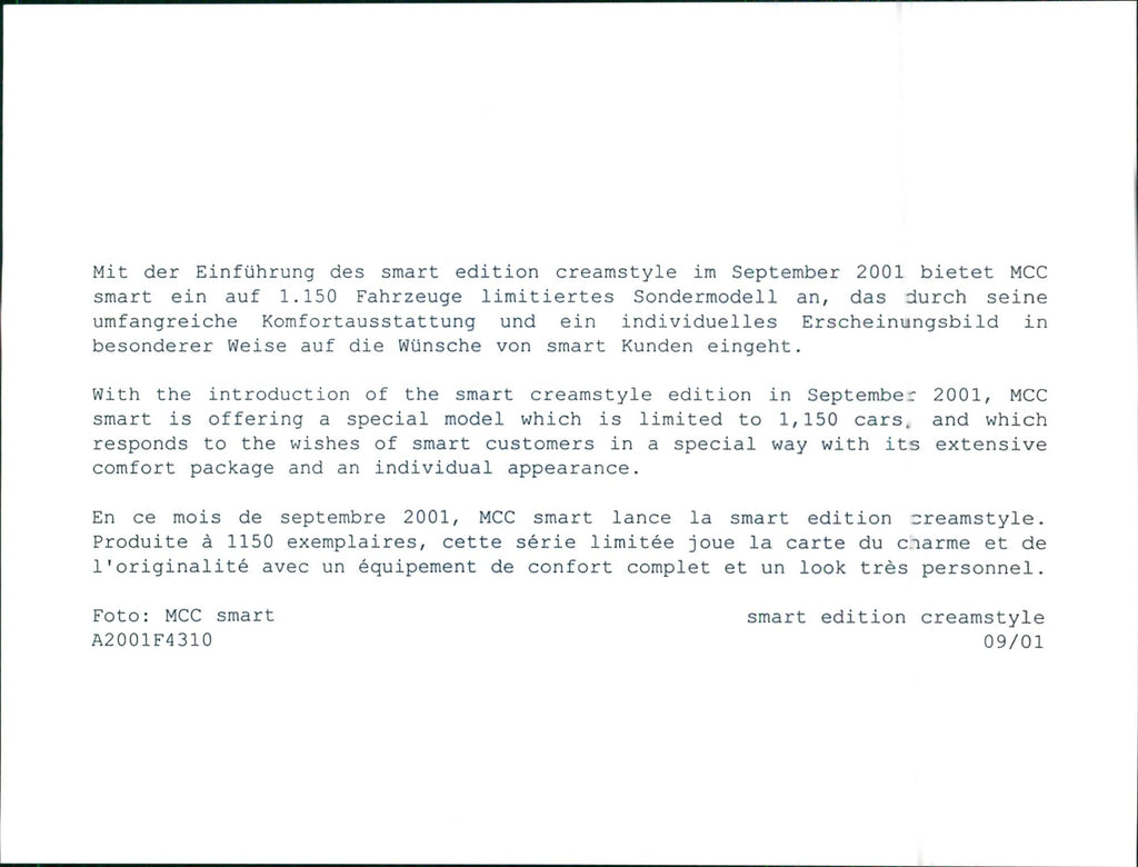 With the introduction of the smart creamstyle edition in September 2001, MCC smart is offering a special model which is limited to 1,150 cars, and which responds to the wishes of smart customers in a special way with its extensive comfort package and an individual appearance.