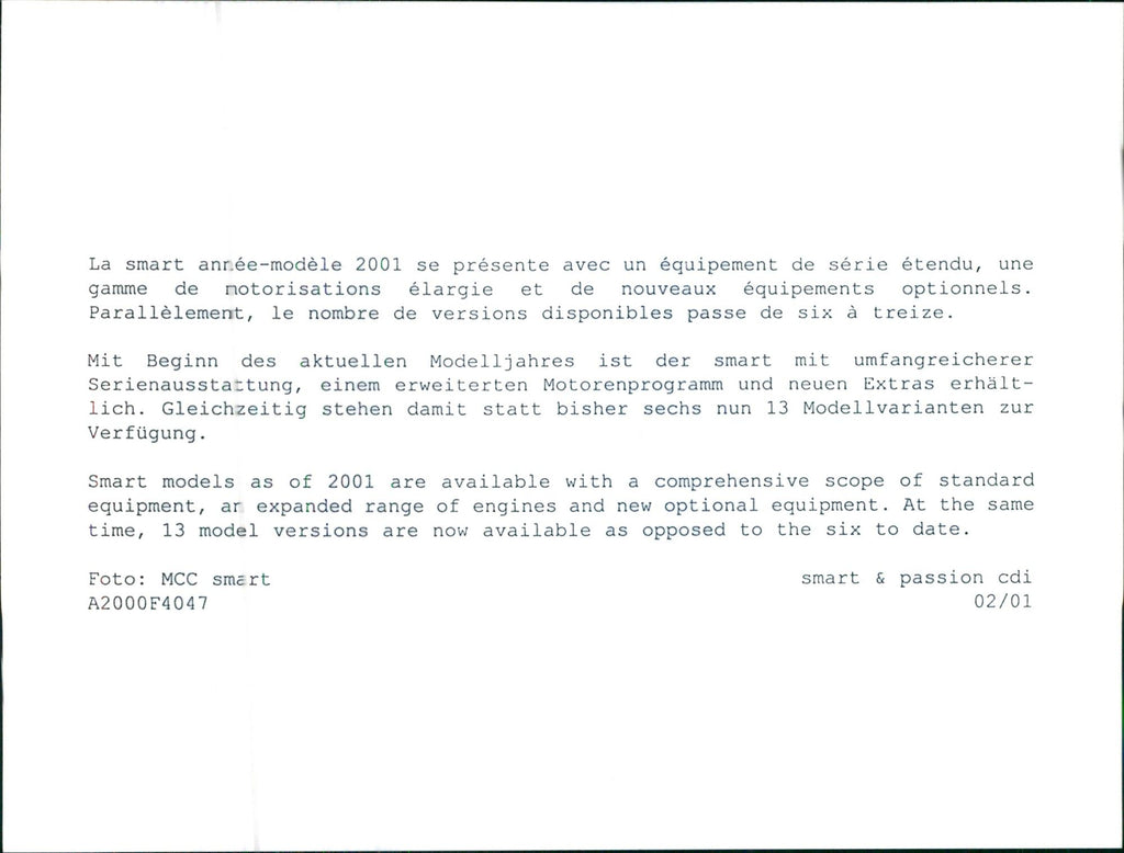 Smart models as of 2001 are available with a comprehensive scope of standard equipment, an expanded range of engines and new optional equipment. At the same time, 13 model versions are now available as opposed to the six to date.