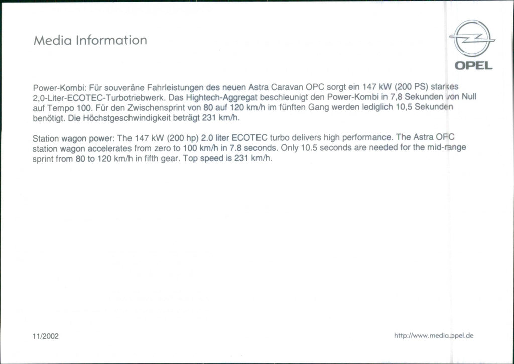 Station wagon power: The 147 kW (200 hp) 2.0 liter ECOTEC turbo delivers high performance. The Astra OFC station wagon accelerates from zero to 100 km/h in 7.8 seconds. Only 10.5 seconds are needed for the mid-range sprint from 80 to 120 km/h in fifth gear. Top speed is 231 km/h.
