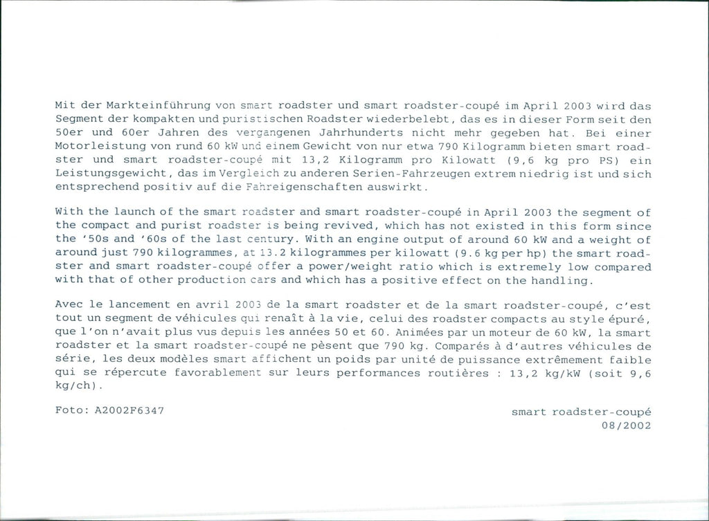 With the launch of the smart roadster and smart roadster-coupé in April 2003 the segment of the compact and purist roadster is being revived, which has not existed in this form since the '50s and '60s of the last century.