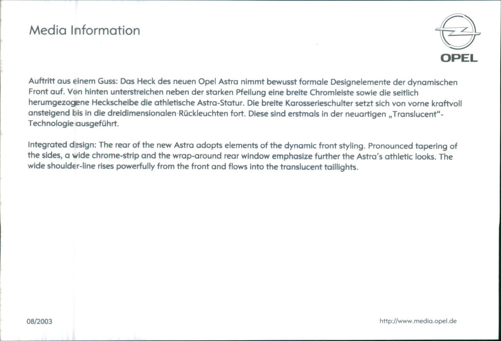 2003 Opel Astra, Integrated design: The rear of the new Astra adopts elements of the dynamic front styling. Pronounced tapering of the sides, a wide chrome-strip and the wrap-around rear window emphasize further the Astra's athletic looks. The wide shoulder-line rises powerfully from the front.