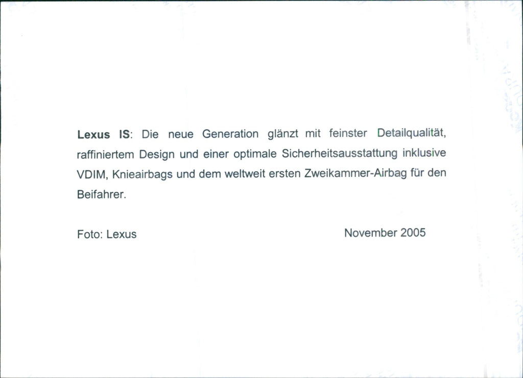 Lexus IS: The new generation shines with the finest detail quality, refined design and optimal safety equipment including VDIM, knee airbags and the world's first two-chamber airbag for the front passenger.