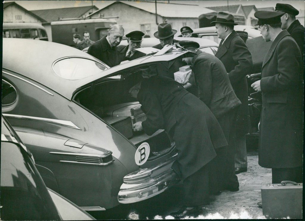 A man is loading the boot of an antique car with a Belgium plate. Men standing around him watching.