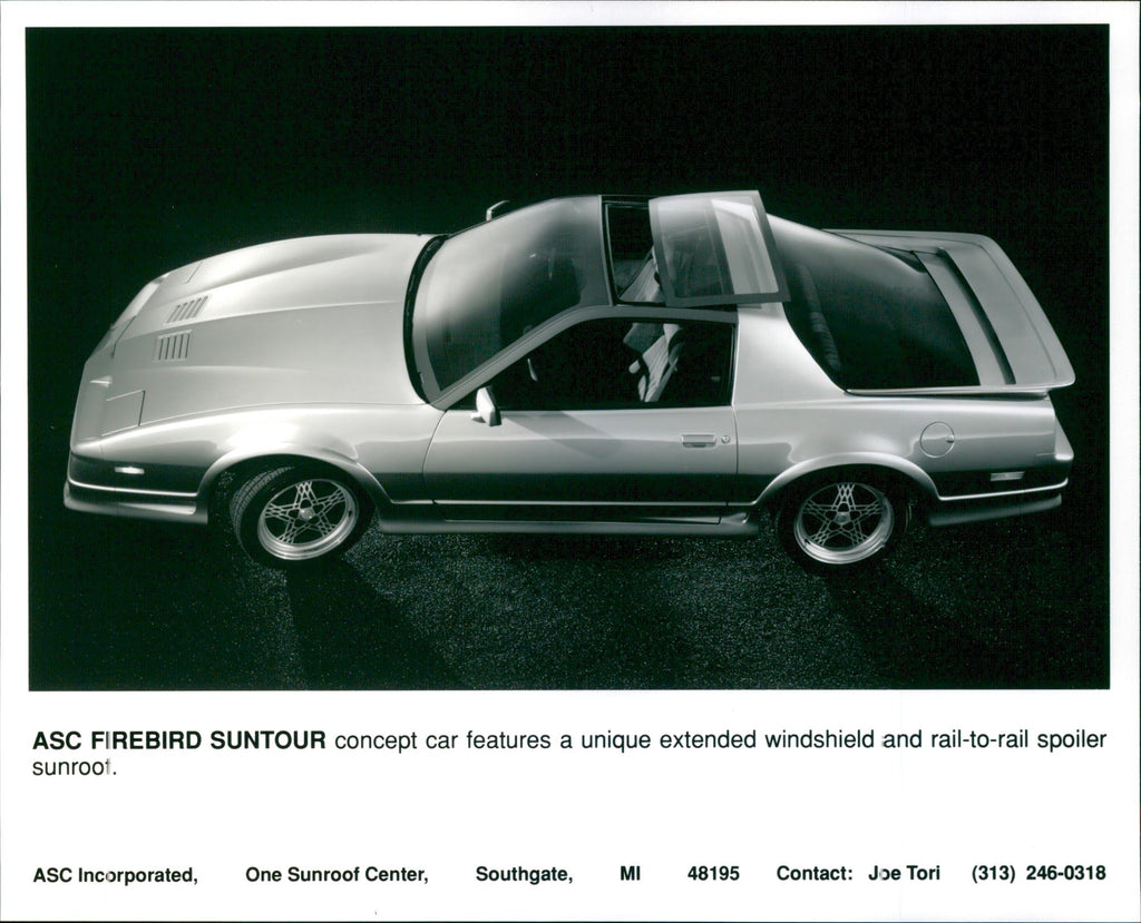 ASC Firebird Suntour concept car features a unique extended windshield and rail-to-rail spoiler sunroof.