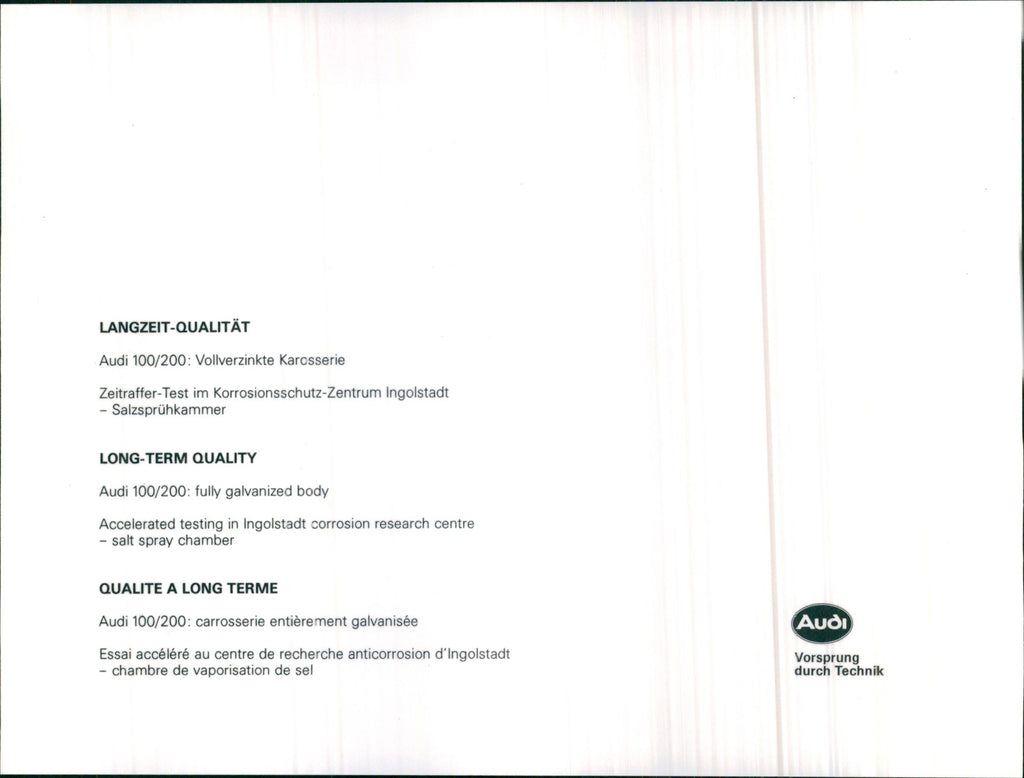 Audi 100/200, Long-Term Quality. Audi 100/200: fully galvanized body. Accelerated testing in Ingolstadt corrosion research centre - salt spray chamber