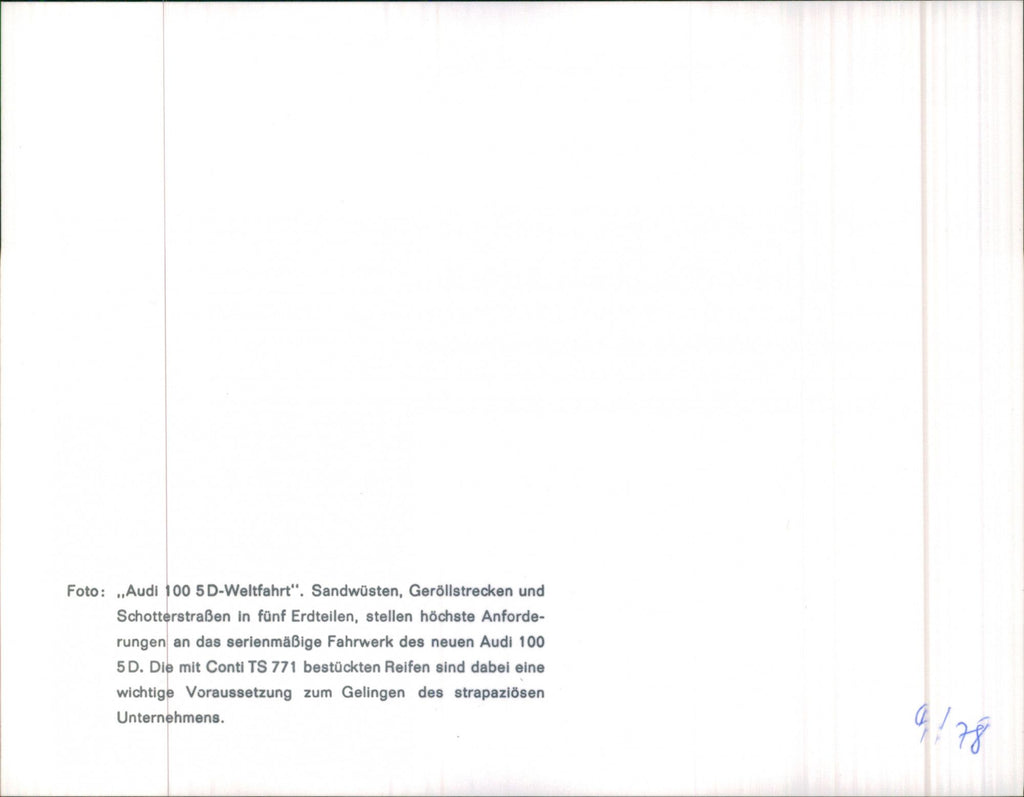 "Audi 100 5D world tour". Sandy deserts, scree and gravel roads in five parts of the world place the highest demands on the standard chassis of the new Audi 100 5D. The tires fitted with Conti TS 771 are an important prerequisite for the success of this exhausting company.