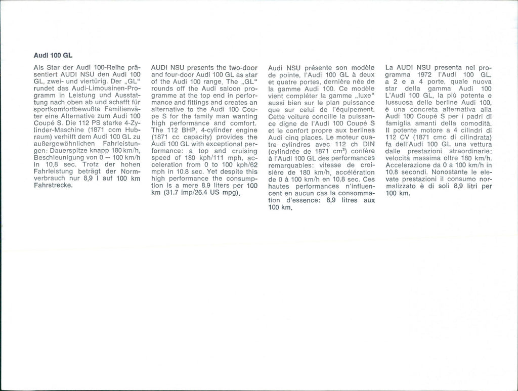This car combines the power worthy of the Audi 100 Coupé S with the comfort of five-seat Audi sedans. three cylinders with 112 hp DIN (1871 cc displacement) gives the Audi 100 GL remarkable performance: speed cruising speed of 180 km / h, acceleration from 0 to 100 km / h in 10.8 sec.