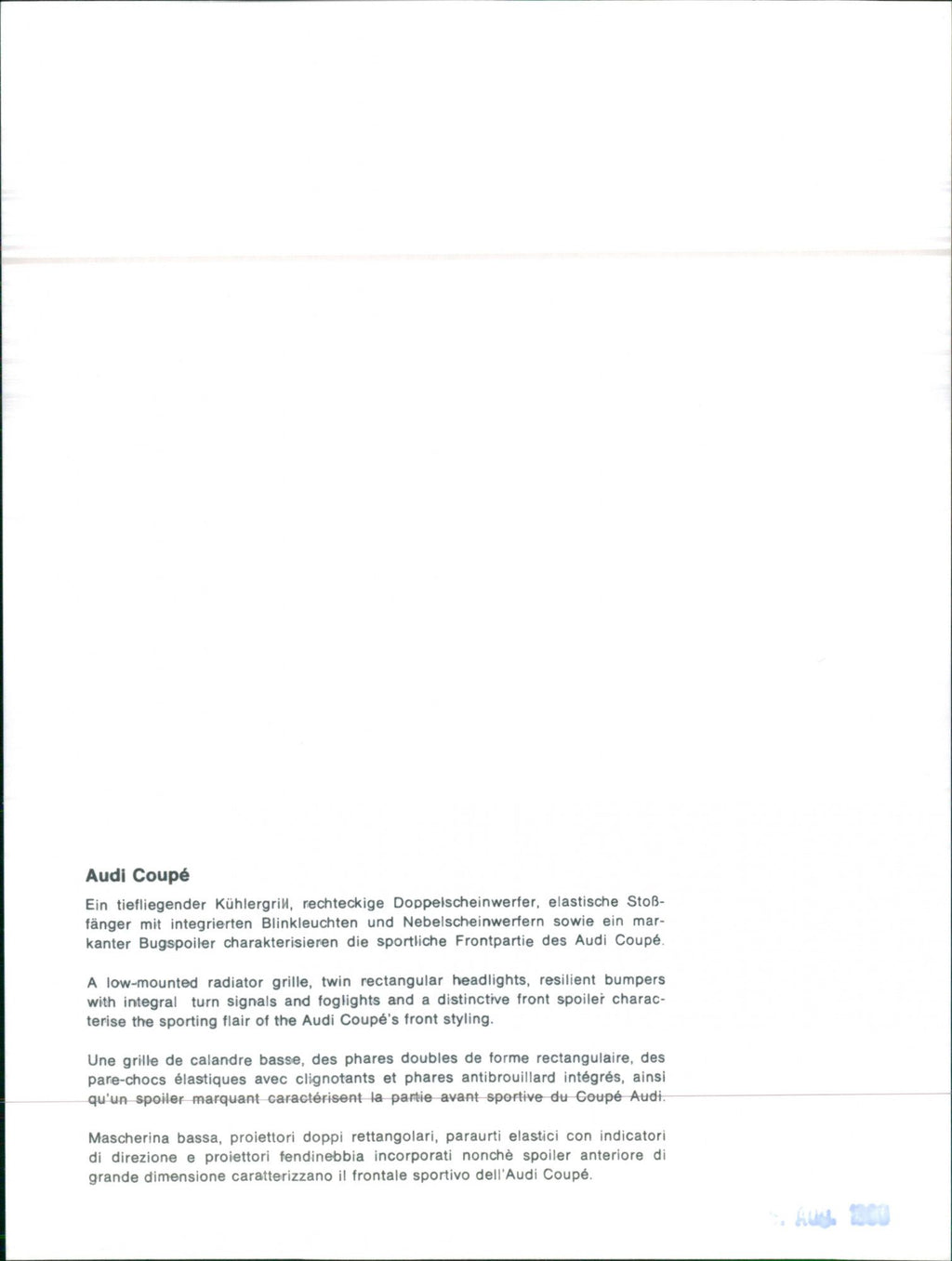 A low-mounted radiator grille, twin rectangular headlights, resilient bumpers with integral turn signals and foglights and a distinctive front spoiler characterise the sporting flair of the Audi Coupé's front styling.