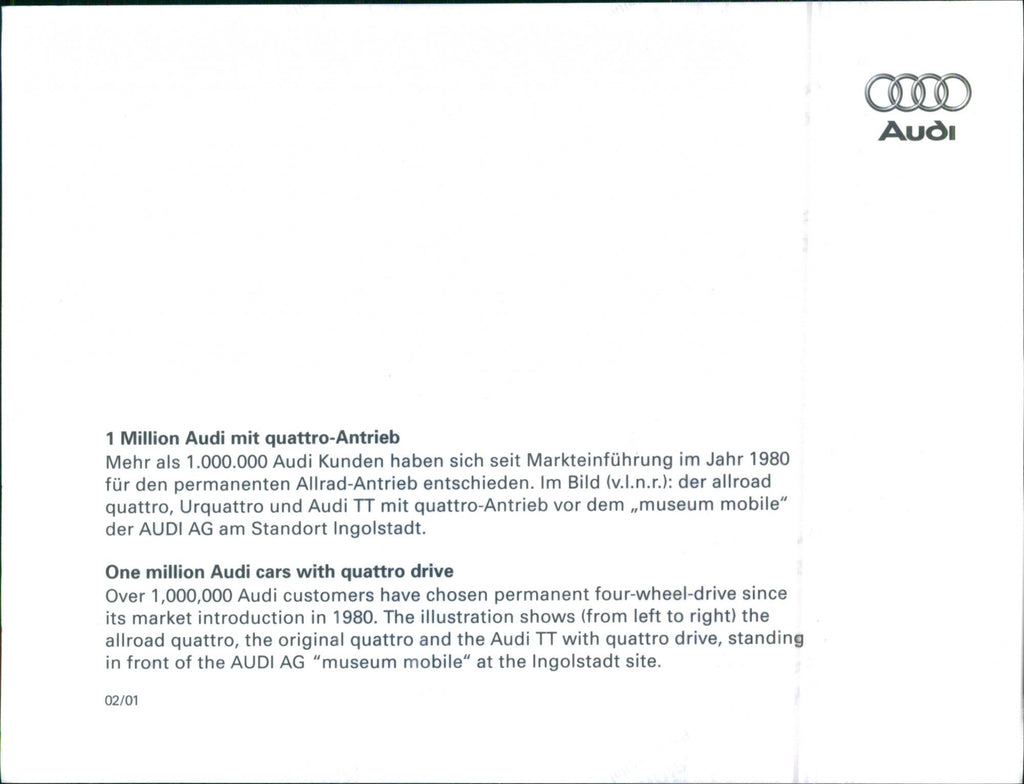 Since the market launch in 1980, more than 1,000,000 Audi customers have opted for permanent all-wheel drive. In the picture (from left to right): the allroad quattro, Urquattro and Audi TT with quattro drive in front of the "museum mobile" of AUDI AG in Ingolstadt.
